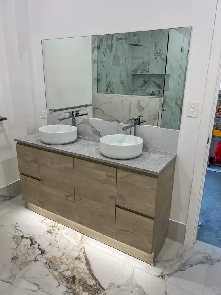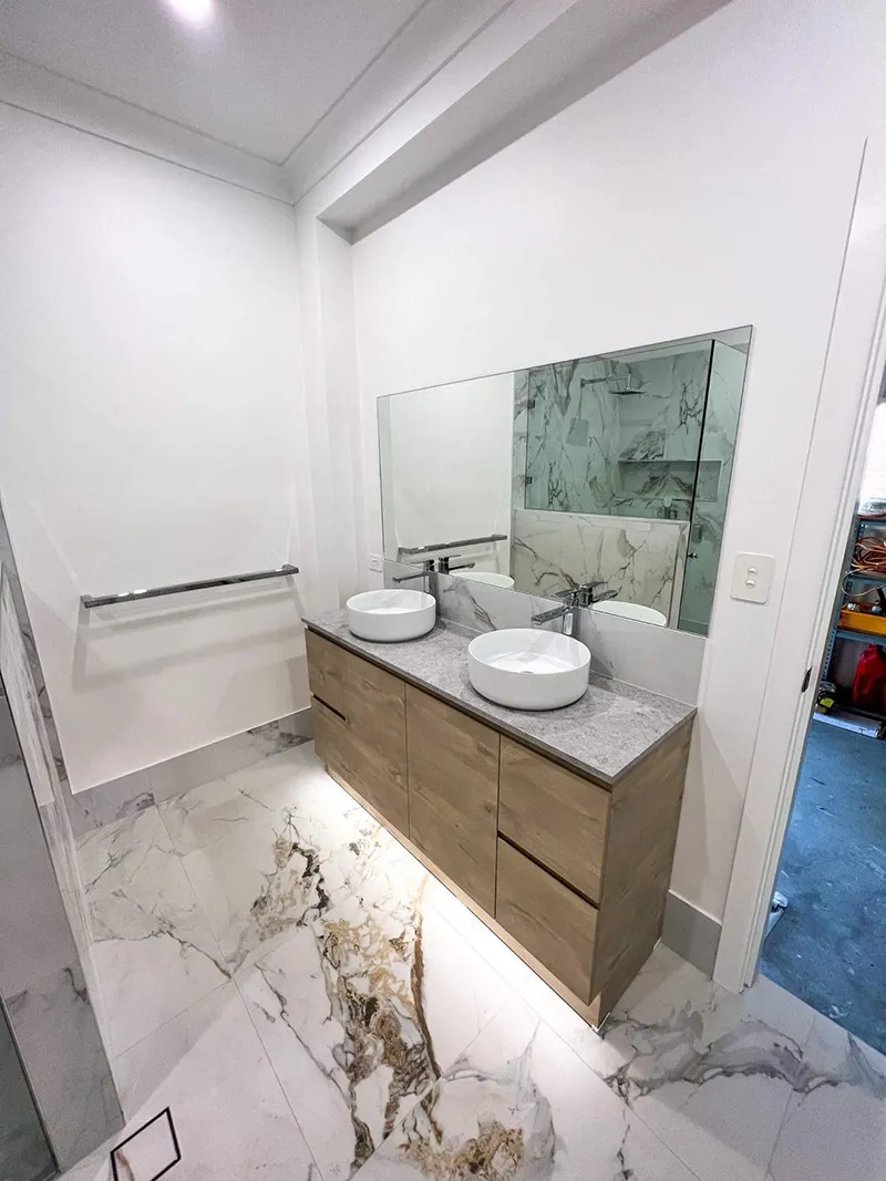 Our Bateau Bay project is a beautiful two storey home which needed a laundry to be converted into an accessible bathroom. This bathroom is a contemporary look with a white tile that has a contrasting colour vein through to connect with the timber look vanity. Having a nice wide space between vanity and shower for easy access and then a good spacious shower with bench seat included.