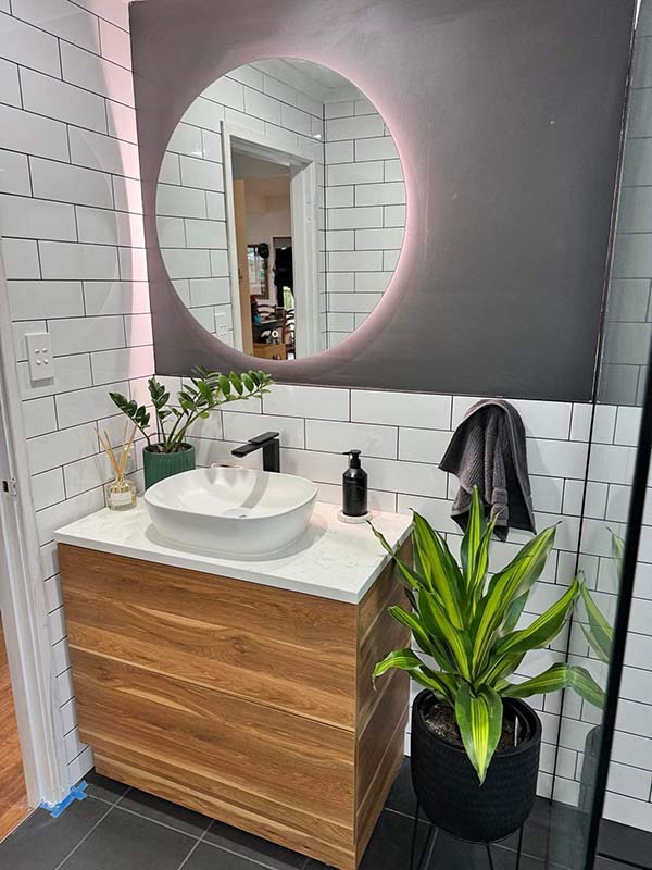 Joppa is an industrial inspired bathroom with the elements of dark grey concrete look tiles that accent the white subway tile. This is broken up with the timber look vanity and black hardware with the touch of modern LED backlite mirror.