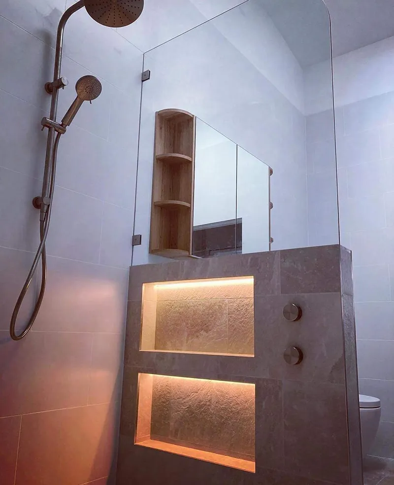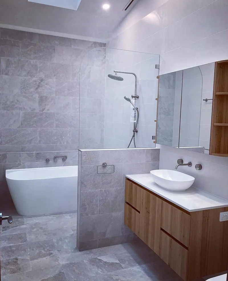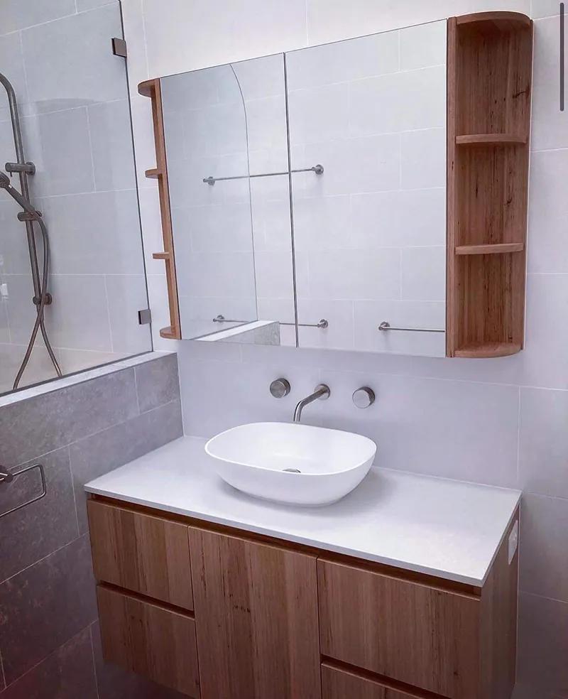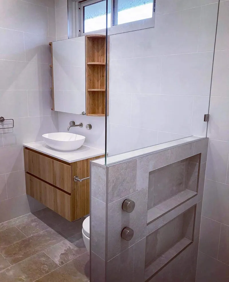 Long Jetty is a modern look bathroom that included all the necessities. Having the grey and white colour scheme with pops of timber. The have used smart ways to add in extra storage that doesn’t catch your eye. Having mirrored shaving cabinets with shelved ends and hidden double niche on the internal shower wall.