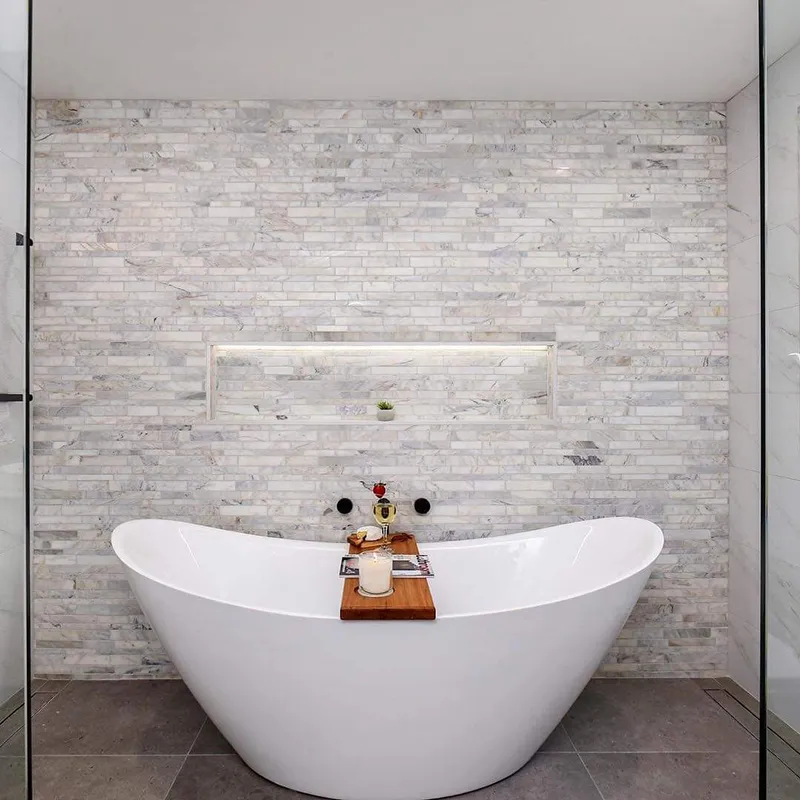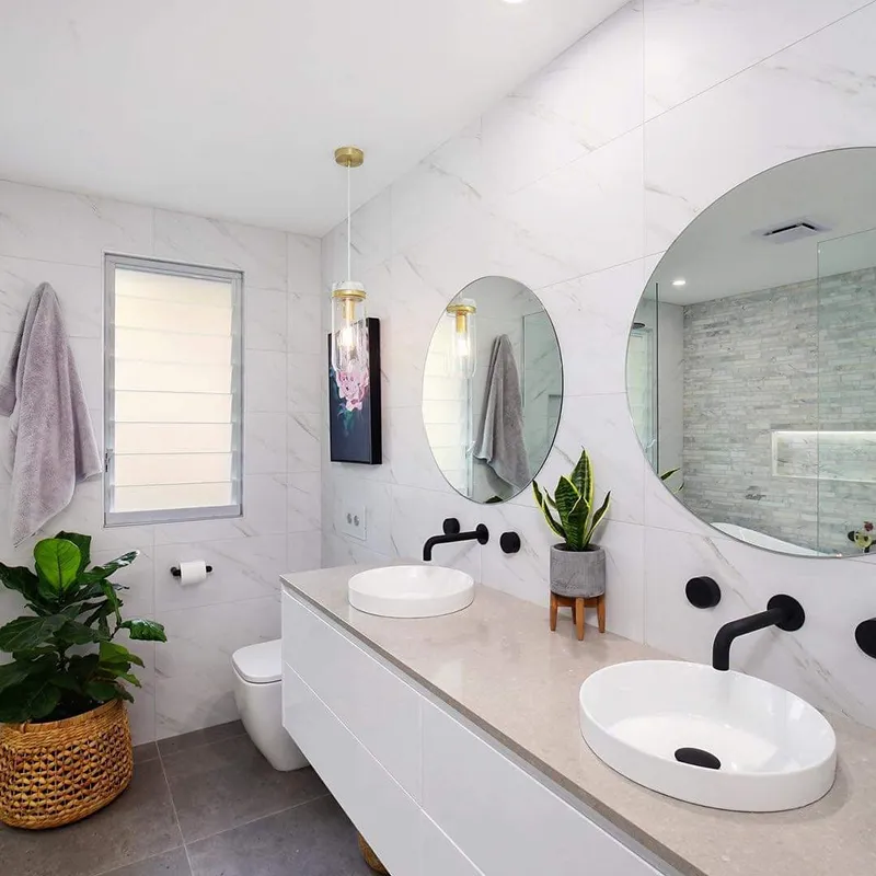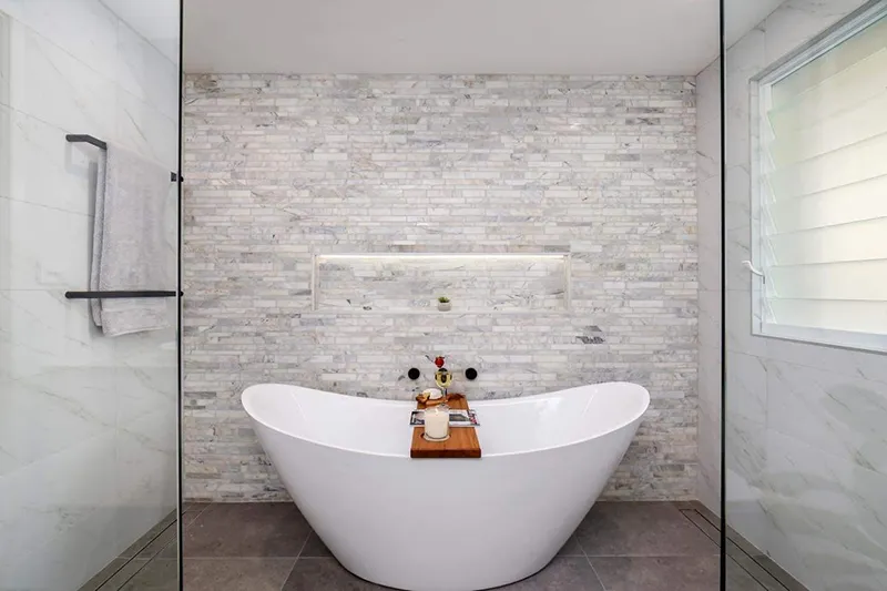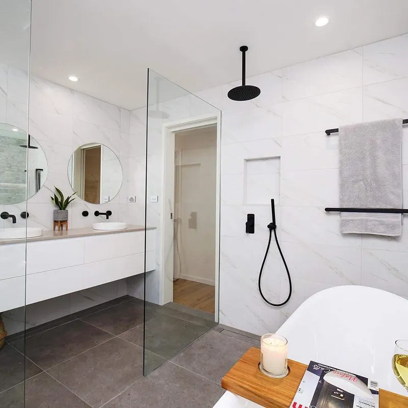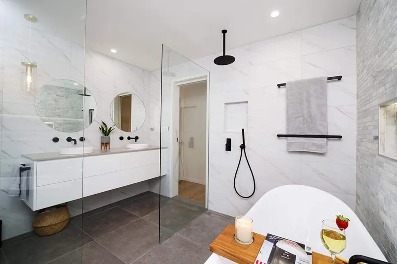 Willow Glenn is a modern bathroom that contains a wet zone. This modern bathroom has the two shower panels diving this beautiful bathroom down the middle. The wet zone consisting of double shower and freestanding bathtub that backs onto the textured tile feature wall. Once on the other side of the glass you have the toilet and double basin double mirror vanity space. The wall hung vanity and freestanding bath brings an added level of luxury to this bathroom that’s complemented and finished off with black hardware and a stunning feature pendant light.