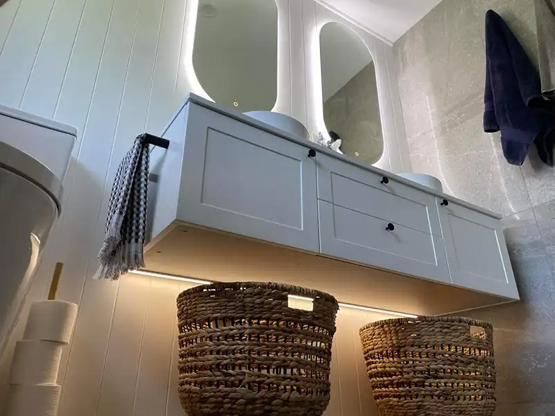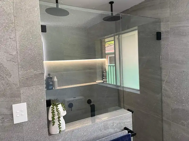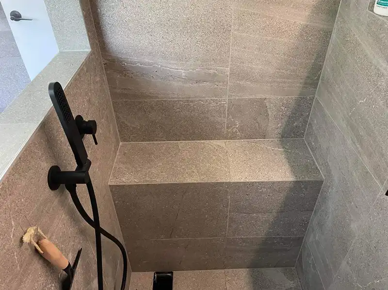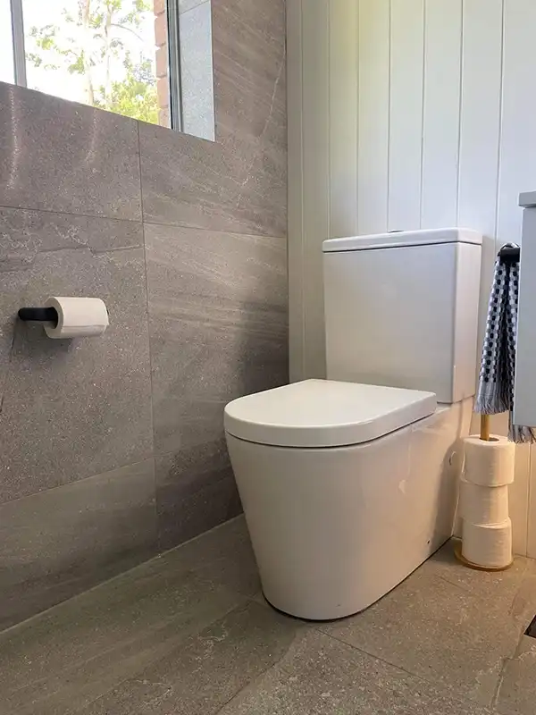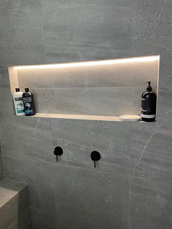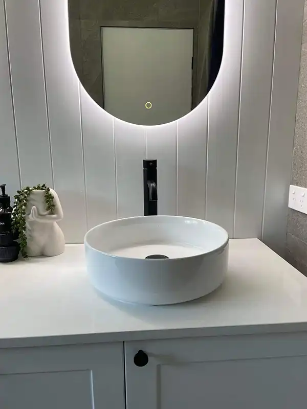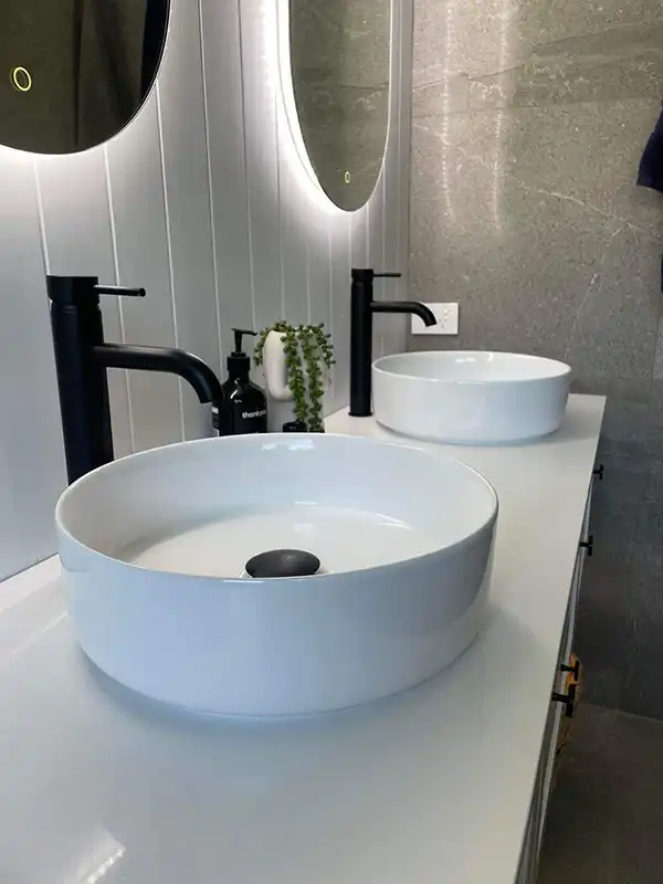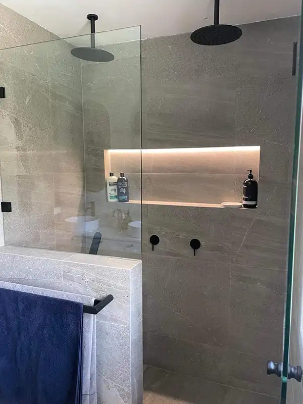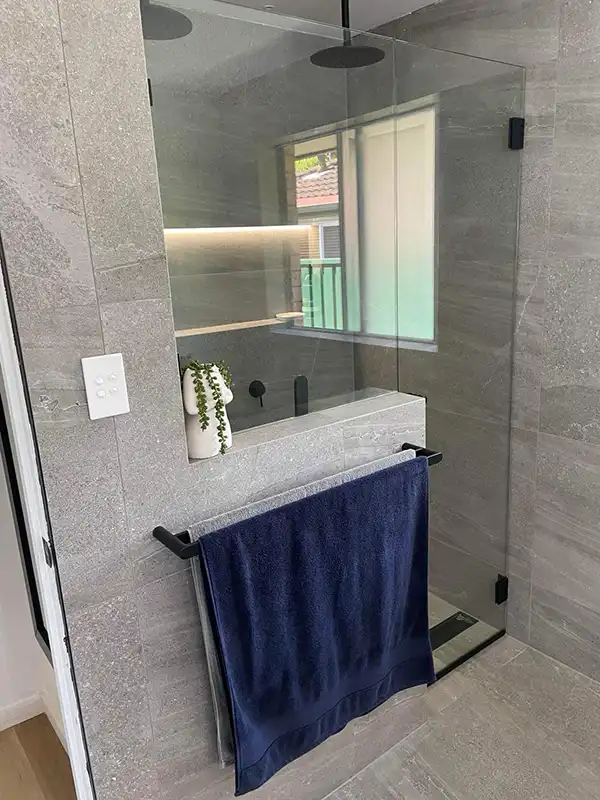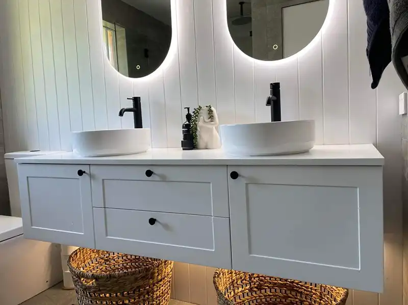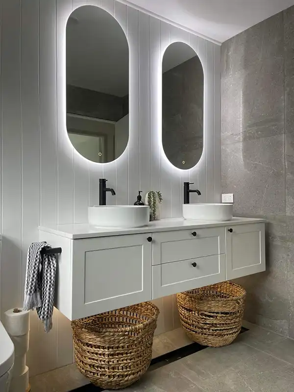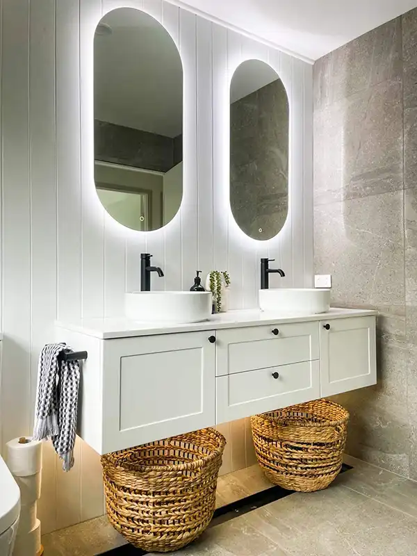 Our Wyoming project is a mix of industrial and Hamptons. With the concrete look tiles and black hardware that flows with white VJ panelling behind the Hampton style vanity finished off with double bowl basins topped with LED mirrors. This client chose to remove a bathtub and replace with a double shower area that includes a shower bench seat.